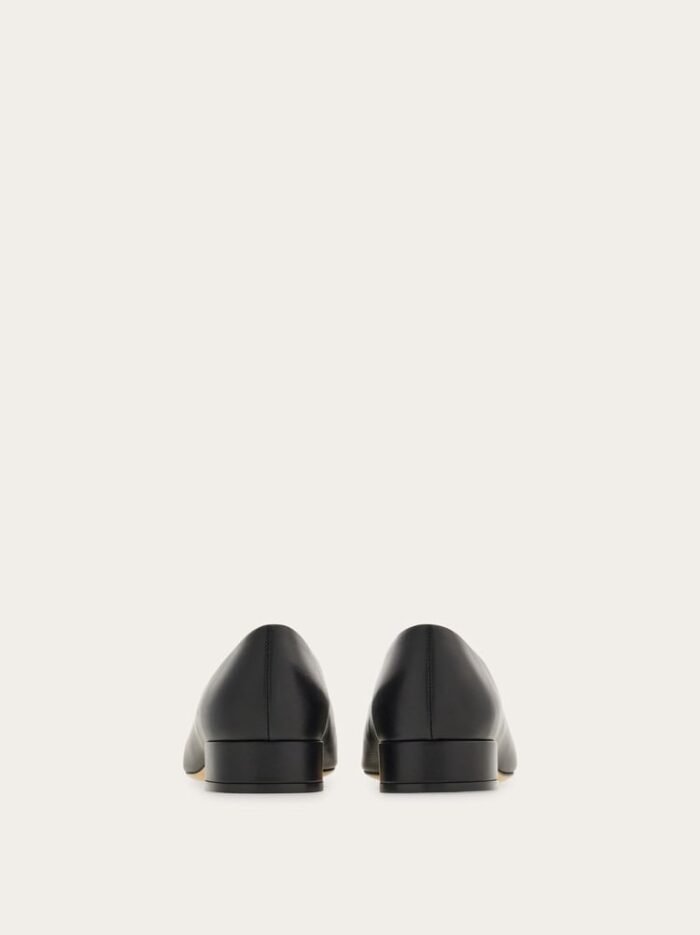 Available in several shades, with various unique color combinations, this new Ferragamo pump will add a touch of personality to any outfit. Made of the softest kid leather, it has a new two tone Gancini buckle at the tip for a nod to sixties style. Low covered heel, leather sole.