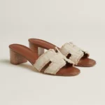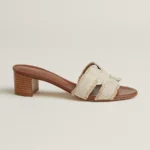High heel sandal in fringed linen canvas with iconic ‘H’ cut-out detail.
