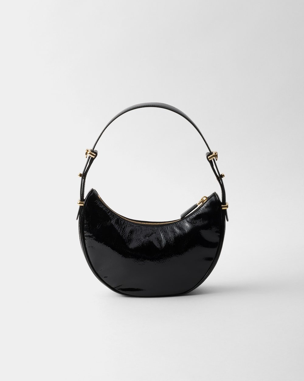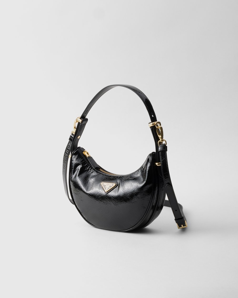 The soft, sinuous lines of the Prada Arqu?? bag are emphasized by the naplak patent leather that gives the accessory a distinctive shiny effect and texture with vintage allure. Elegant gold-tone hardware embellishes the silhouette.