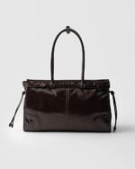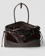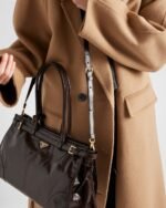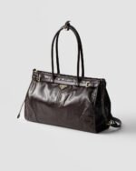 This pragmatic and refined handbag is made of soft leather with a glossy finish that emphasizes its versatile, modern allure. The geometric design blends different influences into one style with a distinctive but sleek aesthetic. Embellished by the sophisticated strap detail, the rectangular silhouette has a roomy interior with zipper pockets. The enameled metal triangle logo completes the look with its iconic signature.