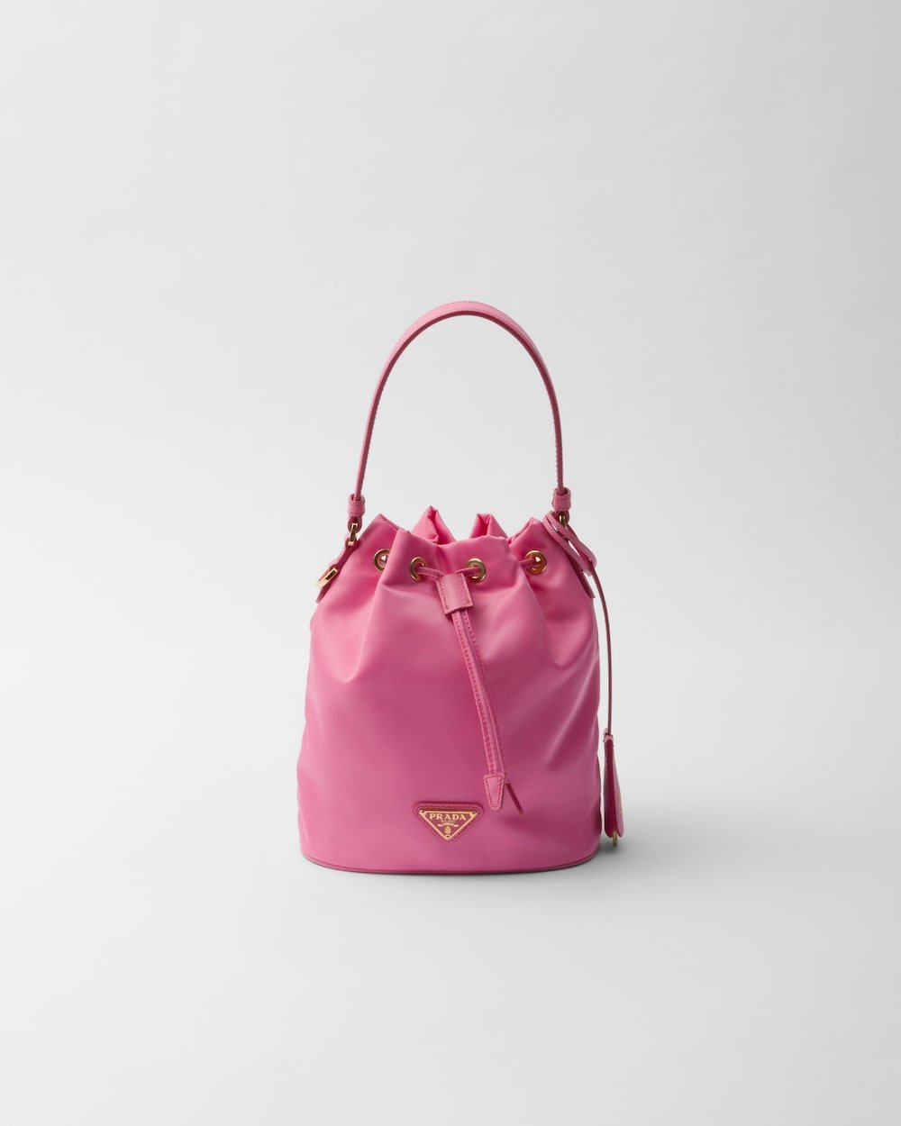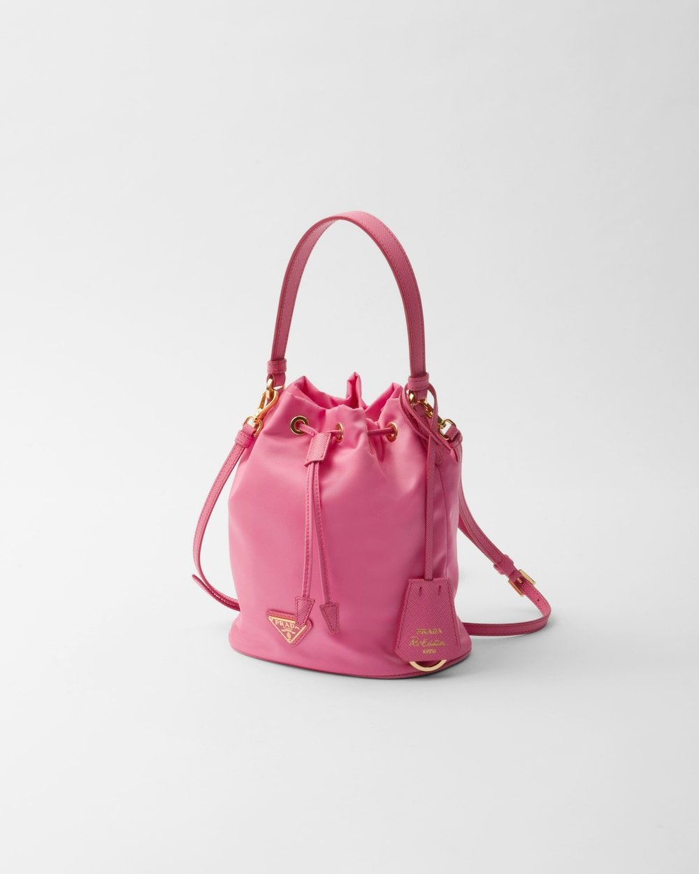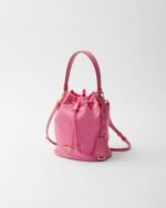 Functional and innovative Re-Nylon is the sustainable evolution of a distinctive material in Prada’s DNA, an expression of the brand’s original and unconventional aesthetic. This mini-bag made of regenerated nylon has an iconic bucket silhouette, a Re-Edition of an archive style, decorated with leather details and metal hardware. The exclusive and refined accessory, carried by a hand or worn with the removable shoulder strap, is embellished with the enameled metal triangle logo.