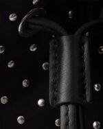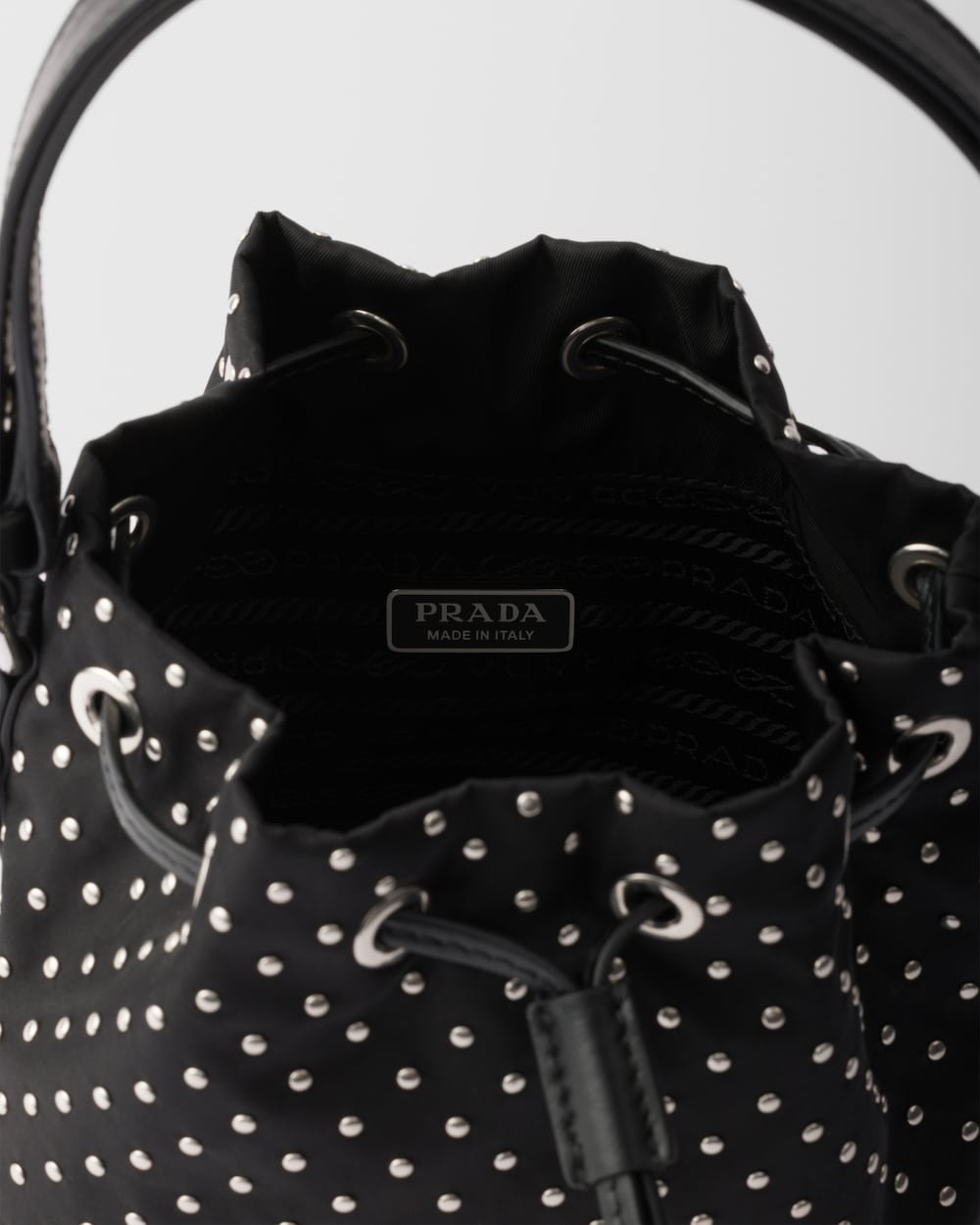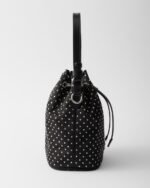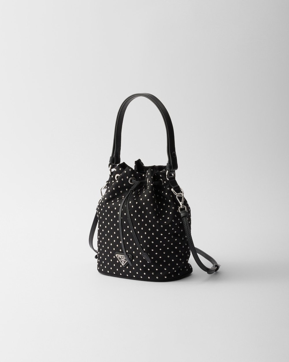 Inspired by an archive design, this mini-bag features a bucket bag silhouette and is crafted from Re-Nylon, an evolution of Prada’s iconic fabric. The refined silhouette is enriched with mini studs that add a contemporary edge to the accessory.