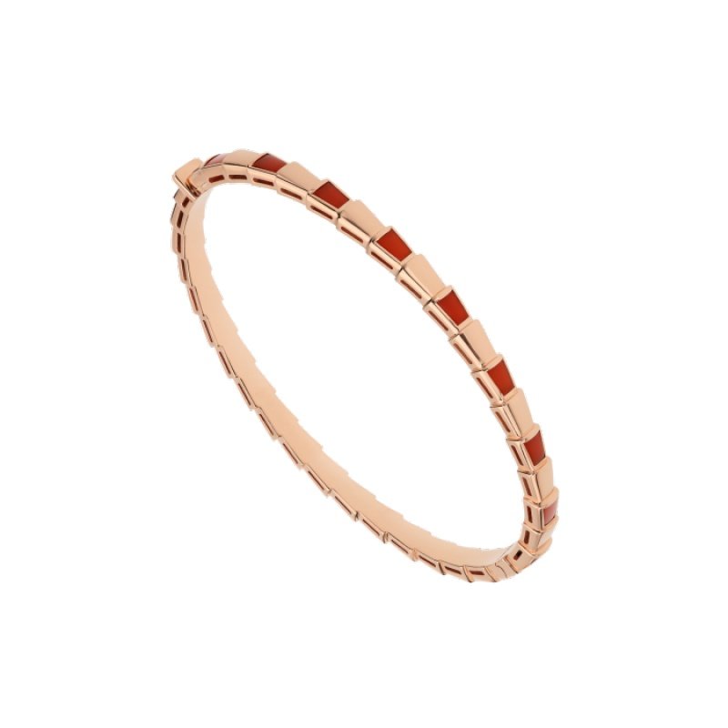 Coiling around the wrist like a sinuous serpent, this bracelet combines the beauty of precious scales with the danger of the snake’s coiling. Between light and shadow, intellectuality and sensuality, seduction and desire, the fascinating design fully demonstrates the irresistible contradictions in the nature of the snake. Serpenti Viper series 18K rose gold bracelet inlaid with carnelian. Width 4 mm.