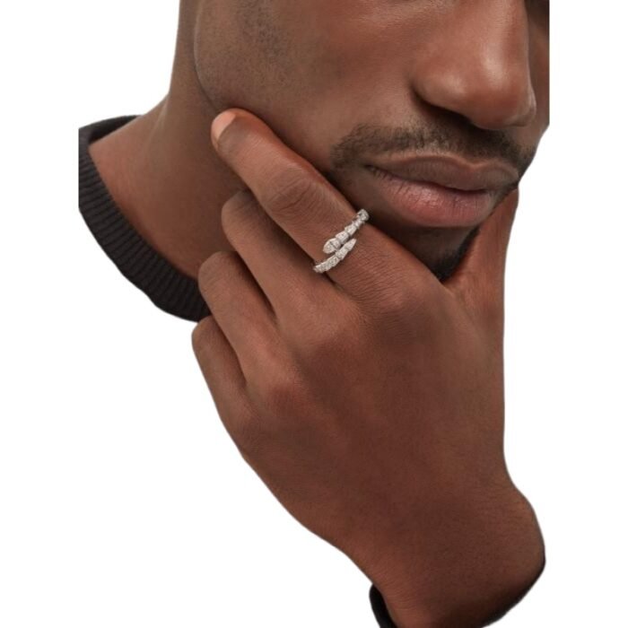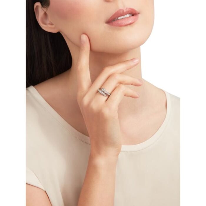 The Serpenti Viper ring in 18K white gold, fully pave-set with diamonds, is a signature style that combines pure beauty, circumferential shapes and allure, a simple and concise interpretation of the endless transformation and evolution of Bulgari’s classic creations. This glamorous jewelry piece embodies the powerful characteristics of the mysterious snake’s constant transformation, inspiring people to actively seek change and regard it as an inexhaustible source of strength and confidence. It is suitable for mixing and matching at will, providing a variety of styling options, showing the flexible and versatile style of the series.