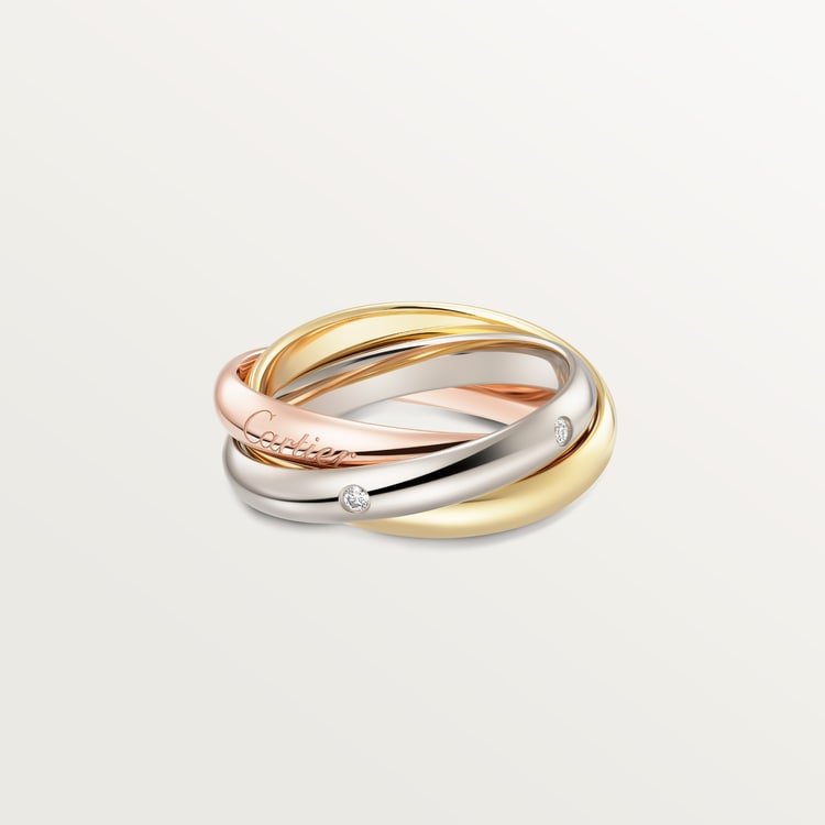 Product Description: Trinity ring Medium model 18K white gold (750/1000) 18K rose gold (750/1000) 18K yellow gold (750/1000) Set with 5 brilliant-cut diamonds totaling 0.06 carats Width of one ring: 3.2?mm (for size 52)