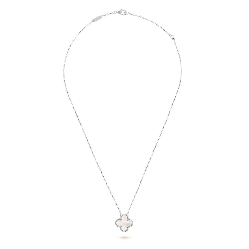 Vintage Alhambra pendant, rhodium plated 18K white gold, white mother-of-pearl.The pendant is attached to the necklace’s chain