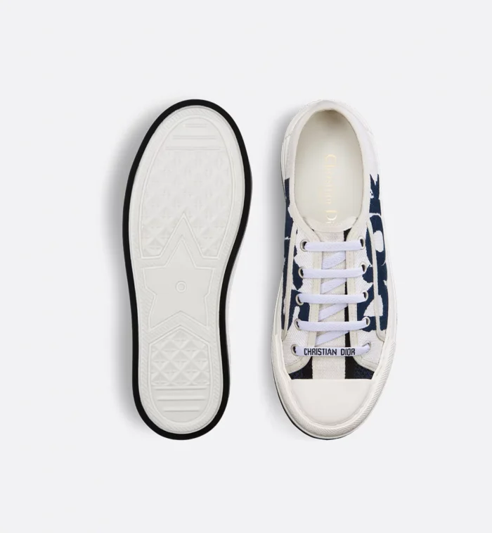 The Walk’n’Dior platform sneaker showcases the deep blue Miss Dior Graffiti motif, a nod to the 1967 debut ready-to-wear collection and a manifesto to Maria Grazia Chiuri’s signature celebration of feminism. The white cotton style features a comfortable thick sole, tongue and Christian Dior laces. The sneaker will add a contemporary touch to any laid-back look and can be coordinated with other Miss Dior Graffiti creations.