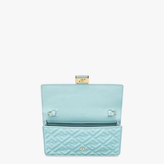 Compact Baguette wallet with flap and FF clasp. Interior compartment with six card slots. Double shoulder strap, an adjustable leather option and a detachable thin chain option:to carry the bag like a clutch, under the arm or wear it cross-body. Made of shiny, light blue nappa leather with a three-dimensional, embossed diagonal FF motif. Gold-finish metalware.