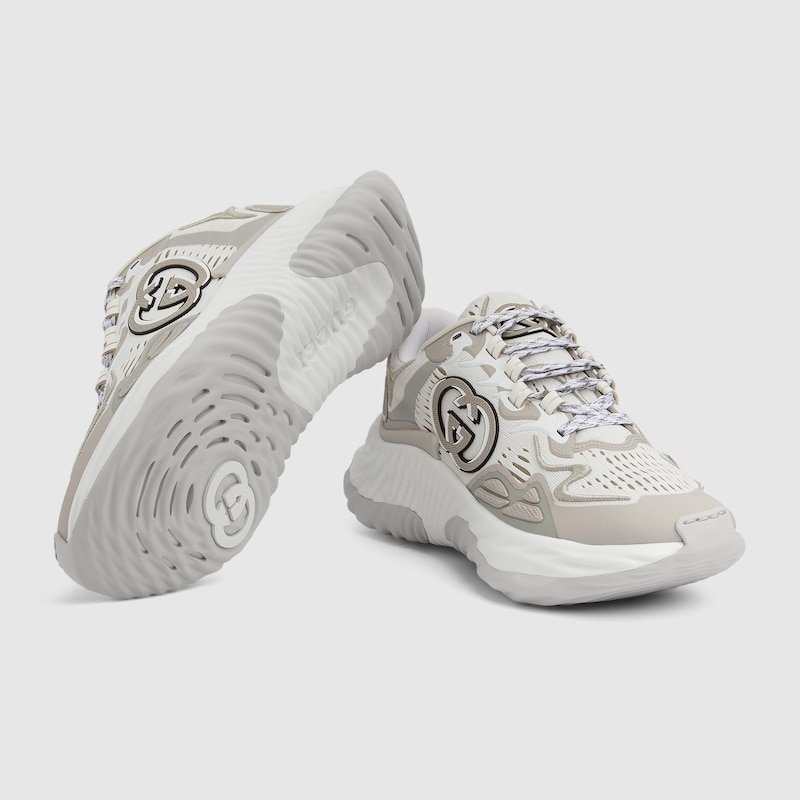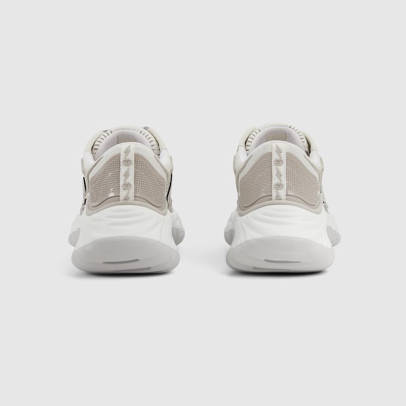 The Gucci Ripple sneaker features innovative stitching techniques which emulate the fluidity of water. The breathable mesh design is complete with three-dimensional elements which flow from the upper to the outsole, such as an Interlocking G leather patch with a 3D effect and a Gucci lettering metal hardware.