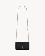 Cell phone holder with front flap decorated WITH THE CASSANDRE, featuring a leather and chain shoulder strap.